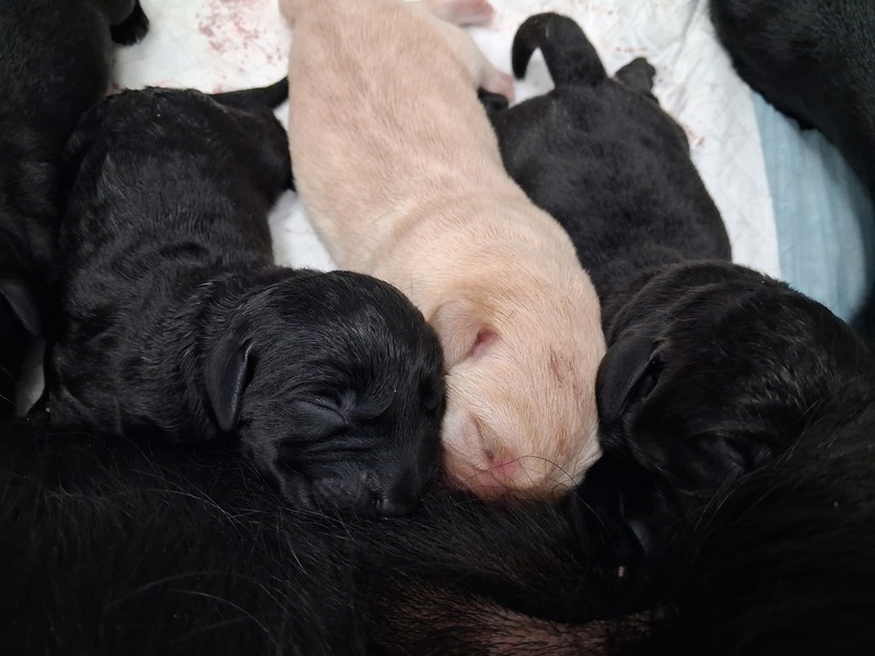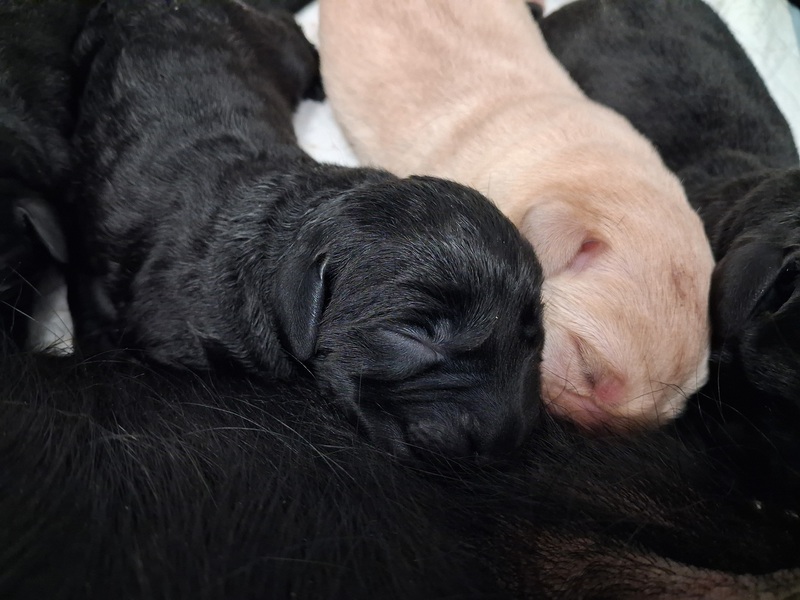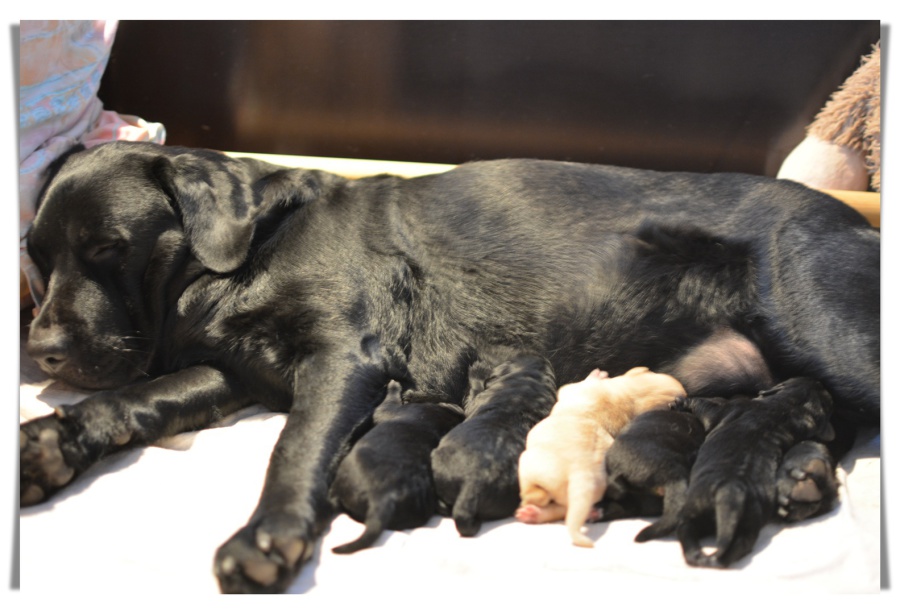 5 kleine Zwerge sind heute "geschlüpft". Unsere Carla wurde zum ersten Mal Mama und hat die Geburt prima gemeistert. 1 gelber und 2 schwarze Rüden und 2 schwarze Hündinnen sind mit einem Geburtsgewicht zwischen 400 und 500 Gramm ins Leben gestartet. Wir sind überglücklich, genießen die Aussicht neben der Wurfkiste und freuen uns auf die bevorstehende gemeinsame Zeit.