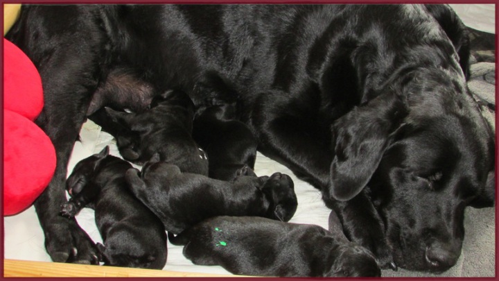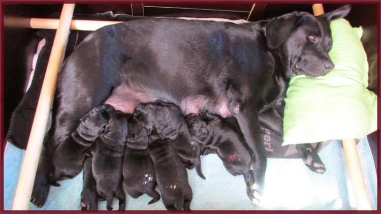 Nun nehmen unsere "blinden Maulwürfe" ganz langsam ersten Kontakt mit ihrer Umwelt auf. Die Augen beginnen sich bei 2 Hündinnen bereits zu öffnen. Auch sind erste Ansätze von wackeligen Gehversuchen zu beobachten. Mit Hingabe und ständig besorgt werden die kleinen Lakritznasen von Mama Amy liebevoll versorgt. Amy`s Milchbar ist sehr ergiebig, was das tägliche Kontrollwiegen bestätigt. Nach einer Woche hatten alle Welpen ihr Geburtsgewicht mehr als verdoppelt und nach der zweiten Woche mehr als verdreifacht.