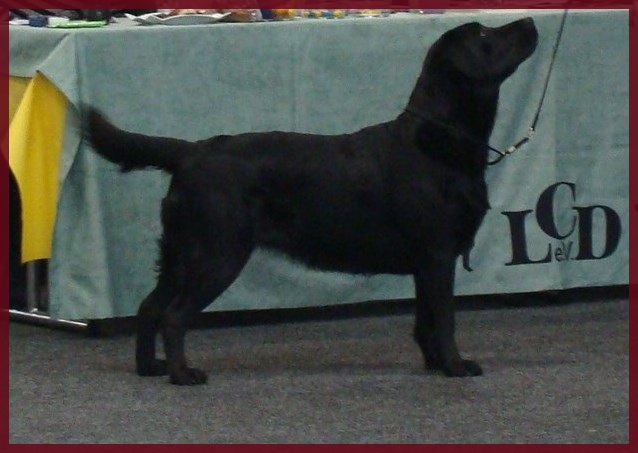 Ansprechende schwarze Hündin, hübscher ausdrucksvoller Kopf, gute Winkelungen, gut ausgewogen, zeigt gutes Fell, bewegt sich gut und wurde gut vorgestellt.
