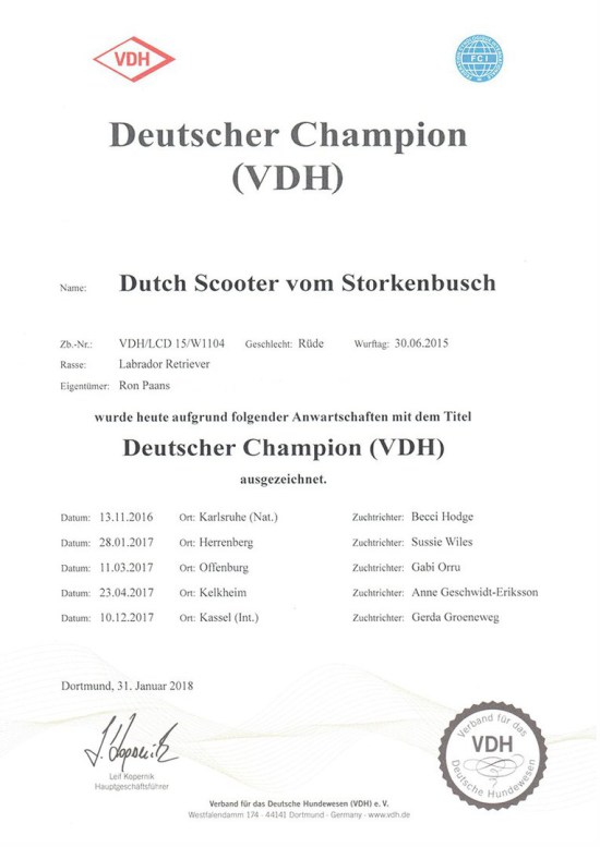 Nun ist es offiziell. Dutch Scooter vom Storkenbusch ist Deutscher Champion. Wir sind mächtig stolz auf Riley und gratulieren erneut Elle zu diesem sagenhaften Ergebnis.