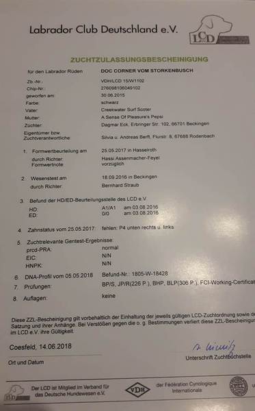 Doc Corner vom Storkenbusch aus unserem D-Wurf hat die Zuchtzulassung als Deckrüde im LCD