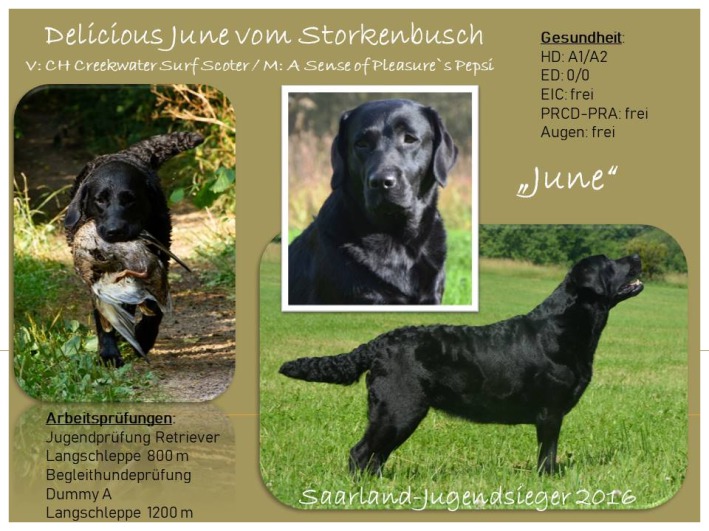 Im Frühsommer planen wir den zweiten Wurf unserer Hündin Delicious June vom Storkenbusch. Die Suche nach einem geeigneten Deckrüden für "Lady in Black" läuft bereits auf Hochtouren. Sobald wir uns entschieden haben, werden wir diesen hier bekannt geben.