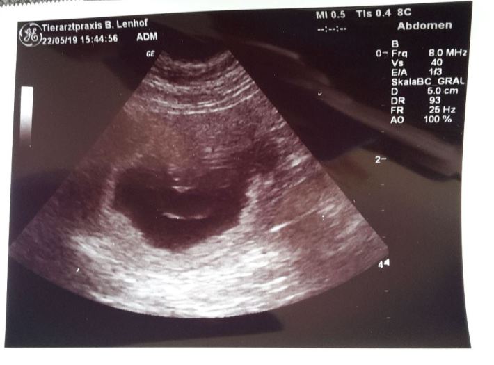 Unser Bauchgefühl hat uns nicht getäuscht. Während äusserlich noch fast nichts auf eine Trächtigkeit hindeutet, geschehen im Inneren der Hündin faszinierende Dinge. Der heutige Ultraschall gab den ersten Blick auf den H-Wurf frei und zeigte anschaulich mehrere Fruchtanlagen.