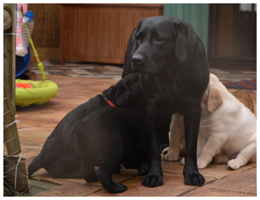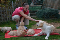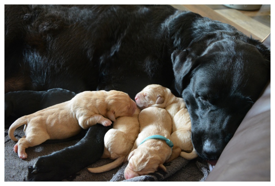 June hat den kleinen Zwergen die Untermiete gekündigt. Die Geburt, bei krassen, fast schon tropischen Temperaturen war sehr anstrengend. Deswegen sind wir sehr erleichtert, dass jetzt sieben putzmuntere Welpen und eine zufriedene Hundemama glücklich in der Wurfkiste liegen. June managt ihre Rolle souverän und äusserst liebevoll. Wir freuen uns über zwei gelbe Rüden, eine schwarze und vier gelbe Hündinnen. Die Welpen aus diesem Wurf sind bereits alle versprochen.