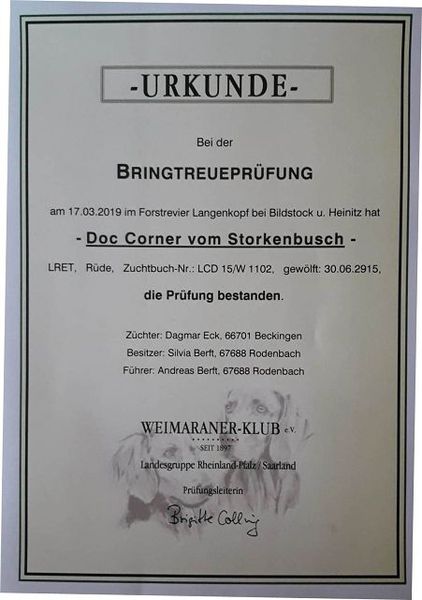 Im März besteht Doc Corner vom Storkenbusch die Bringtreue. Bei dieser anspruchsvollen Prüfung soll der Jagdhund seine besondere Zuverlässigkeit im Bringen unter Beweis stellen. Der Hund wird von seinem Führer ohne Bringbefehl zum Stöbern in die Dickung geschickt und muss innerhalb von 20 Minuten einen der ausgelegten Füchse finden und seinem Führer zutragen. Nochmals ein kräftiges Weidmannsheil an Gebrauchshundeführer Andreas Berft zu dieser beeindruckenden Leistung.
