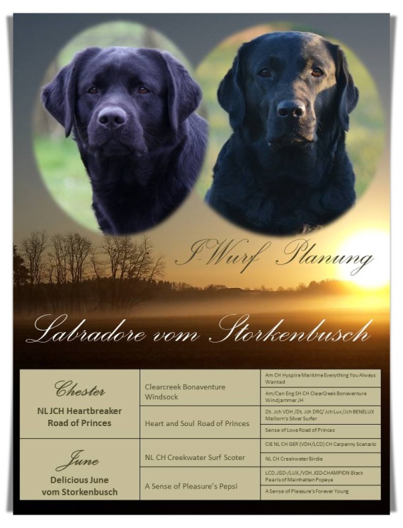 Unser Wurfvorhaben im Winter nimmt Form an. Wir planen den dritten und letzten Wurf mit unserer Hündin June. Bei der Auswahl eines passenden Deckrüden sind wir ein weiteres Mal in den Niederlanden fündig geworden. Wir haben unseren „Mister Right“ in Heartbreaker Road of Princes gefunden, der unserem Wunschbild eines perfekten Labrador sehr nahe kommt. Ein echter Herzensbrecher, wie wir finden. Chester ist Jugend-Champion in den Niederlanden und erfüllt unsere Prioritätenliste, bei der eine gute Gesundheit gefolgt von Charakter und Rassetyp an erster Stelle stehen. Er wurde gezüchtet im Zwinger Road of Princes und wir danken Mark ter Horst, dass wir ihn als Deckrüde einsetzen dürfen. Aus dieser Verpaarung versprechen wir uns typvolle, wesensfeste und genetisch gesunde Welpen. Der I-Wurf wird ein rein schwarzer Wurf.