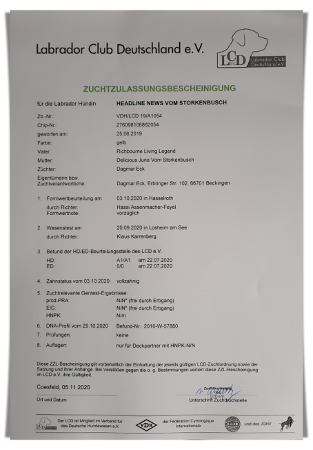 Headline News vom Storkenbusch erhält die Zuchtzulassung im Labrador Club Deutschland e. V.